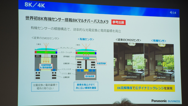 4K/8Kの制作ソリューションのコーナーでは、毎秒60フレームを記録可能な8K有機イメージセンサー技術のグローバルシャッター機能を搭載する、8KマルチパーパスカメラやIR撮影が可能な4Kコンパクトシネマカメラ「AU-EVA1」を展示。