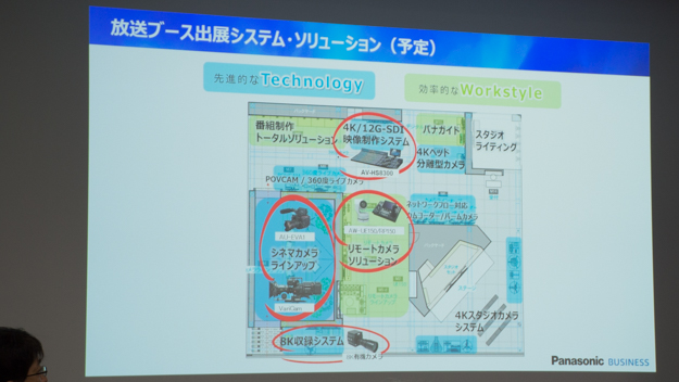 制作ワークフローを支援するソリューションのコーナーでは、業界初の4K/60P対応、超広角75.1度(水平画角)、12G-SDI他多彩な4Kインターフェースを装備した新製品リモートカメラシステム「AW-UE150」、ライブスイッチャー「AV-HS8300シリーズ」の実機が展示される。詳細は以下の通り。