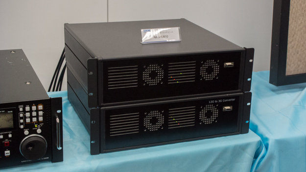 上が8K/4K/HDの映像出力が可能なイメージプロセッシングユニット「AK-SHU810」。下は12G to 3G Converterで3G-SDIで、8Kモニターに出力する