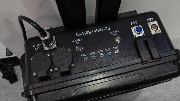 超プロトタイプの3000Whのバッテリー。冒頭で紹介した大容量Vマウントバッテリー「CUE-D300」は300Whなので、10本分の仕様をもっている。48V、24V、ACも出せる。主にライト、照明用を強く意識している。