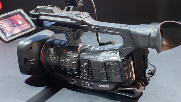 キヤノンブースの目玉は、11月29日に発売予定のXFシリーズの最高峰モデル「XF705」だ。特長はキヤノンの業務用としては初めてH.265を搭載。4K UHD 60Pの4:2:2:/10ビットをSDカードに記録可能。