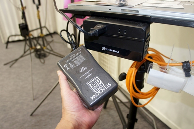 Tether Tools社のDC-ACコンバーターオンサイトパワー。Vマウントバッテリーを電源としてPCのAC電源アダプターへの電源供給のほかUSB電源を装備しており、タブレットやスマホなどの充電も行える。2個のコンセントと5V2AのUSBポートを4つ搭載しており、出力は最大200W