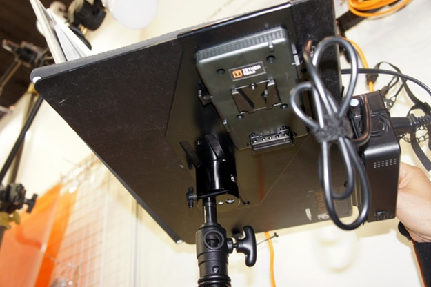 Vマウントのホルダーは裏側にあり、Dタップで接続する。ONsite Aero V-Mountキットはライトスタンドなどに装着して使用することが可能。テーブル上になっているのでラップトップなどを載せて使用することができる