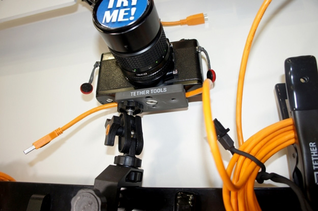 Tether Tools社の新製品テザーブロック。カメラ底部などに装着してケーブルの抜けを防ぐアクセサリーで、ケーブルを引っ掛けたりときにカメラ側のコネクター損傷の防止にもなる。他にもUSB-Cケーブル、VESAマウントなど便利なアクセサリー類を出展