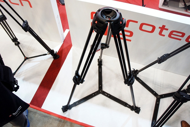 参考出展のManfrotto初のカーボンファイバー製ツインレッグビデオ三脚。自重は約3kgで100mmボール径を採用。75mmアダプターが付属する