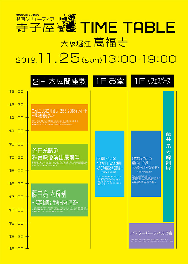 関西で活躍する動画クリエイターたちによる映像研究・人材育成・交流を目的にした勉強ユニット“OMUSUBI”は、次世代クリエーターのためのセミナー&ワークショップ「OMUSUBIプレゼンツ 動画クリエーティブ寺子屋」を2018年11月25日に大阪府・堀江にある萬福寺にて開催する。