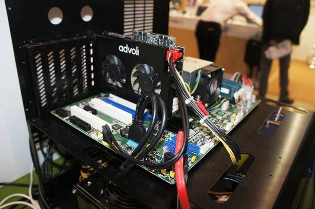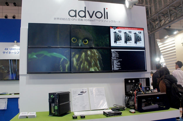 advoli Limited社製の組込型GPU搭載HDBaseTグラフィックカード3機種を出展。HDBaseT送信口を6系統搭載し各送受信機器間をCAT 5e/6ツイストペアLANケーブルで接続。非圧縮の映像(HDMI)・音声(HDMI)・リモコン制御(IR)信号を最大150Mで伝送可能。グラフィックカードに搭載されたGPUにて画像処理を行い、最大4K30p4:4:4(10.2Gbps)フォーマットの映像を各ポートより同時出力ができる