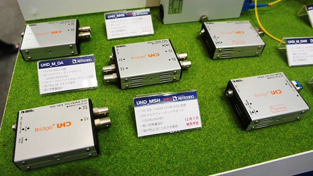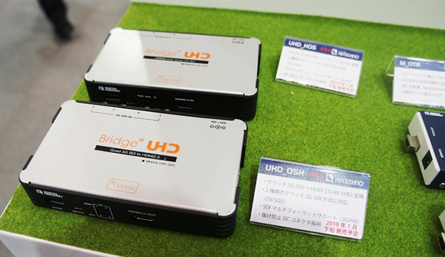 新製品のHDMI2.0→12G-SDIコンバーターUHD_MHSと12G-SDI→HDMI2.0コンバーターなど、Digital Forecast社製のBridgeUHDシリーズを展示。UHD_MSH。4K映像を同軸ケーブル1本で長距離伝送するSMPTEST2082に準拠した12G-SDIとHDMI2.0間の映像・音声信号変換器。UHD_MHSは、1系統のHDMI入力に2系統のSDI出力端子を搭載。4K UHD 60p信号を12G-SDI信号へ変換し、2系統同時分配出力する。UHD_MSHは、1系統のSDI入力をHDMI2.0へ変換出力する他、SDIスルーアウト出力を1系統搭載。HDMIモニターへの送出と同時に12G-SDI対応機器への送出が行える。いずれも2018年12月7日発売予定で価格は税別90,000円前後