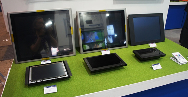 前面IP65対応パネルマウント式組込みモニター。7-19型まで各種サイズがあるほか、タッチパネルやアナログ、デジタル入力などをラインナップ