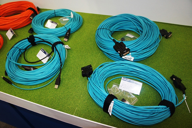プラスチック光ファイバ脱着式マルチAOCケーブル。最大18Gbpsまでの信号を伝送可能で、最長50m HDMI伝送に対応したAHT-xxBやDisplayPort対応アクティブケーブルAPO-xxN、DVI-D対応のADO-xxPなどを出展。長さは10mや100mなど機種により各種ラインナップがある