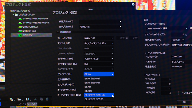 EDIUS Workgroup 9の「カラースペース」メニューを選択するとBT.709やBT.2020などを選択でき、ColorEdgeは選択したカラースペースに自動的に切り替わる