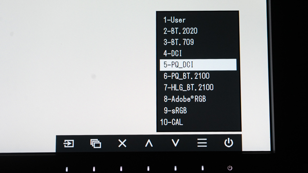CG279Xのモニター本体の前面にある操作スイッチに触れるとガイドが表示される。映像制作専用カラーモードを選択すると、最初からBT.2020、BT.709、PQ、HLGなどの国際規格で定められた色域・ガンマを再現する表示モードが選択可能になっている。