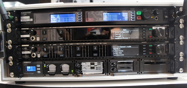 AXT DigitalシリーズはADシリーズ送信機とADXシリーズ送信機と共通のAXT Digital受信機プラットフォームに対応しているほか、High Densityモードにより同時に運用可能なチャンネル数を大幅に増加することが可能。写真は上からAXT DigitalスペクトラムマネージャーAXT600J、AXT Digital2チャンネルデジタル受信機AD4DJ、AXT Digital4チャンネルデジタル受信機AD4QJ、ラックマウント型充電ステーションSBRC-J-P