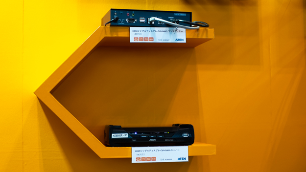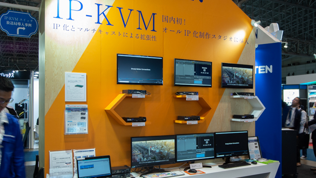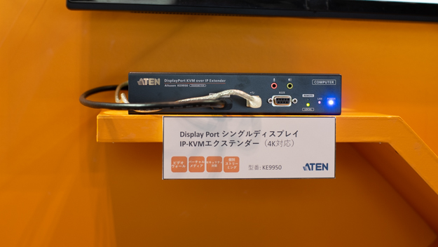 ATENジャパンブースの一押しは、4K HDMI対応のIP-KVMエクステンダーKE89シリーズ。イントラネット経由でUSBコンソールとHDMIディスプレイの延長が可能で、ブースでは3対3で組んで展示が行われていた。放送局・ポスプロ等での導入が増えており、国内初のオールIP化制作スタジオを実現した三重テレビにKEシリーズが導入されたことも紹介していた。