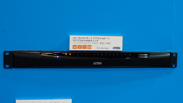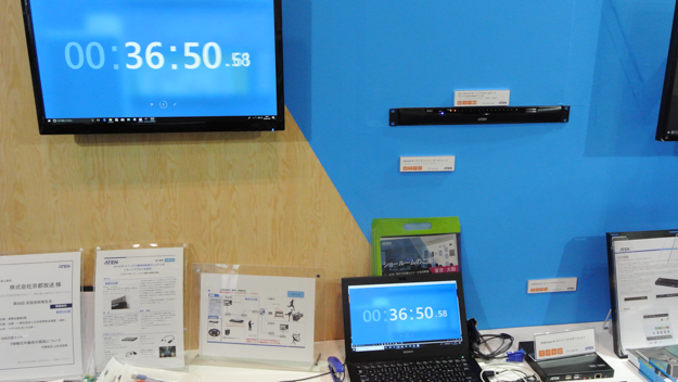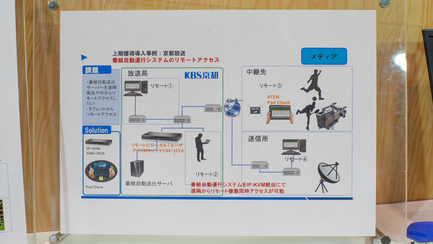 別コーナーでは、リモート2ユーザー16ポートIP-KVMスイッチ「KN2116VA」を展示。京都放送では、番組自動運行システムのリモートアクセスに導入されているという。テレビ局には番組自動送出システムが必ずあるが、地方局などの場合でロケや出先にいる場合は電話などで番組自動送出サーバの目の前にいる人にコンタクトをとって状況を確認していた。