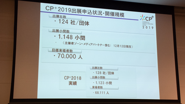 CP+は国際都市・横浜を舞台に10周年を迎える世界をリードする総合的カメラ映像展示会。2010年にスタートし、2019年度で10回目を迎える。前回は68,000人を超える動員を記録し、今年は7万人の来場者を目標にしている。2019年度の出展社数は124社で、出展小間数の総計は過去最大の1,148小間とあるという。