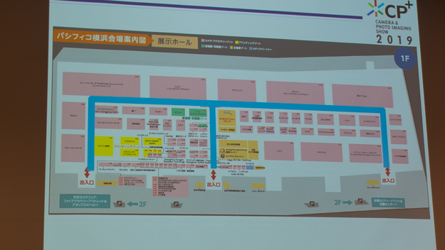 会場の案内図。もっとも広いのはソニーブース、その次は富士フイルムブース、キヤノンとニコンが同小間数の大きさのようだ