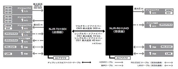 NJR-T01SDIは、SDI入力信号を光ファイバーケーブルで長距離伝送するAV over IPエンコーダ。SDI入力信号を汎用性のあるHDMI信号に変換出力するため、SDI入力を含むAV over IPシステムを同社のIP-NINJARシリーズとの組み合わせで、シンプルに構築できるとしている。ローカルモニター用出力も備えているため、安価なHDMIモニタでのプレビュー出力や収録も可能。また、SMPTE規格に準拠した3G-SDI、HD-SDIまたはSD-SDI映像信号および音声を光ファイバーケーブルで長距離伝送し、RS-232Cの双方向通信と1Gネットワークの伝送にも対応している。NJR-T01SDIの主な特長は以下の通り。