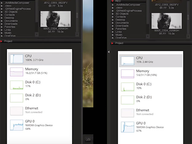 左は通常、右側はCUDAアクセラレーションを展開した後のパフォーマンス負荷値。GPUにオフロードされ、CPU 50%以下、GPU 60%程度に処理が分散される。CUDA-GPUになると、バッファがかかっていた8K R3D RAWファイル再生が、なめらかに実行された。RED DRAGONで収録した4K-6K映像データであれば、超速処理が期待できる