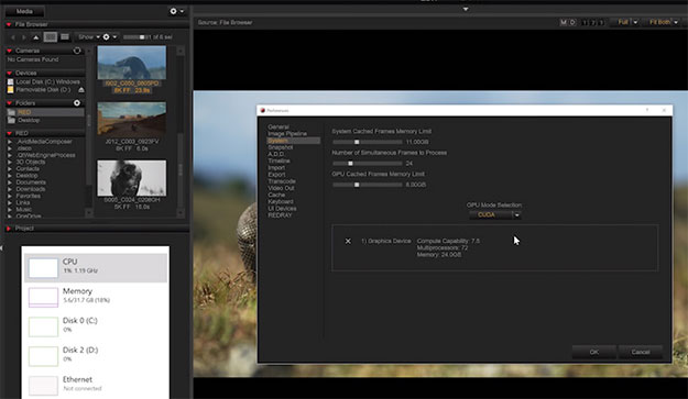 RED-CineX(ベータ版)でシステムプリファレンスからCUDAをアサインする。これでCUDAベ―スのアクセラレーションがGPUに展開される
