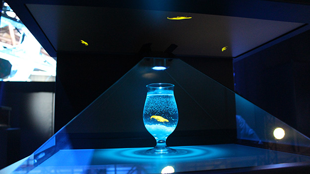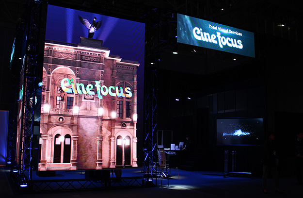 シネ・フォーカスブースは、毎年3Dホログラムシステムに注目が集まっているが、今回は新たに開発した3m×2mサイズのホログラムフレームユニット「CFF-QU3020」を展示。軽量の可搬型フレームにホログラム演出用の特殊フィルムを予め張ってあるため、イベント会場への搬入や設置を短時間でスムーズに行うことができるとしていた(残念ながら写真撮影はNG)。