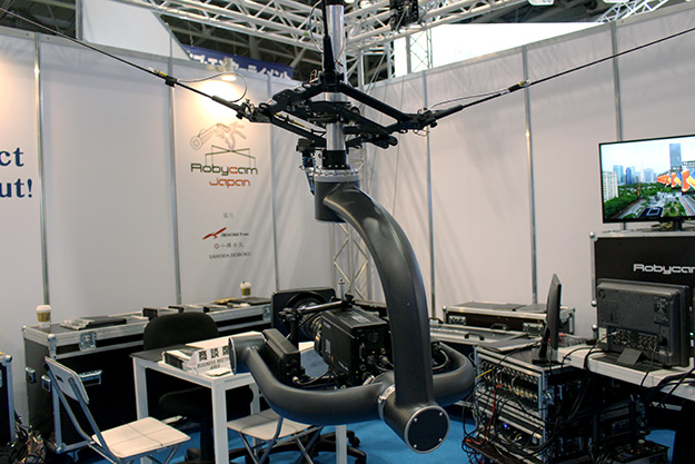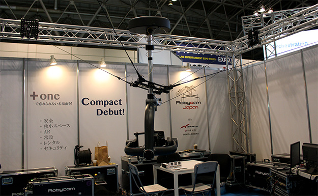 4点吊りケーブルカメラシステム「Robycam Compact」を展示。Robycam Compactは縦横無尽に空中を可動し、様々な角度のアングルで撮影可能。Compactは、スタジオや展示ブースや小型から中型の会場でコンパクトに使用するように設計されており、設置の柔軟性と安全性を保持している。