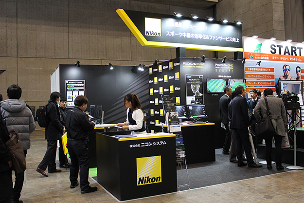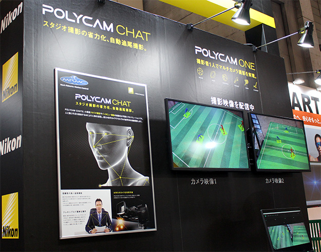 ニコンシステムブースでは、「撮影自動化/省力化」「ファンサービス向上」に有効な撮影ソリューションを展示。フィールドスポーツ向け半⾃動追尾撮影ソリューション「POLYCAM ONE」や、⾃動追尾撮影ソリューション「POLYCAM CHAT」の紹介が行われていた。