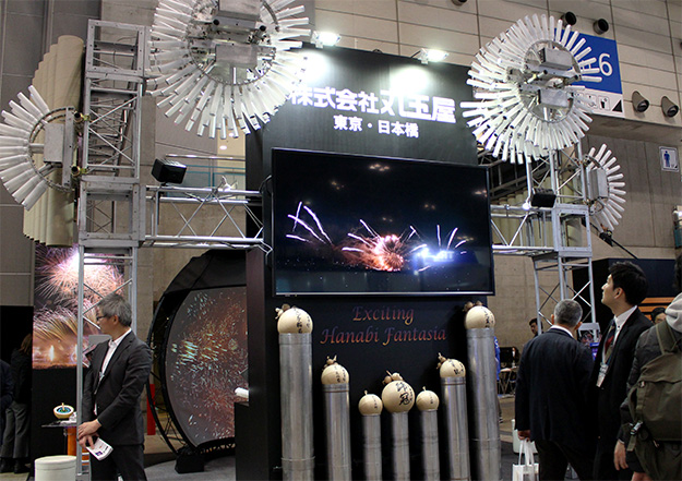丸玉屋は、1990年に創業し、音楽と花火をシンクロさせたショー「花火ファンタジア」を開発。以来、日本全国のテーマパーク、花火大会、ライブ会場等のあらゆる環境で年間500を超える花火ショーを実施している会社だ。ブースでは、新しい花火鑑賞方法「ハナビリウム」を展示していた。
