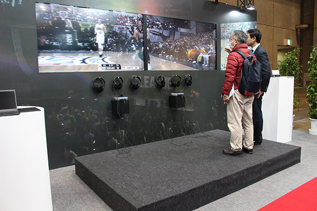 次世代型ライブビューイングでは、8Kワイドスクリーンとサラウンド立体音響による臨場感、音のAR技術と低遅延・双方向伝送による一体感、プレーを盛り上げるための演出としてICTガジェットが活用されている。ブースでは高精細な映像と臨場感のある音声だけでなく、選手のドリブルや靴の音など、試合中のコートの振動と合わせて床が振動する仕組みとなっていた。
