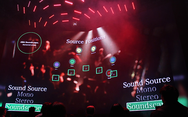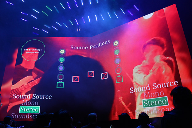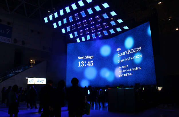 AVCのブースでは、ムービングLEDパネル「Wing Panel」と、ビジュアルモーションコントロールシステム「Kinesys」の組み合わせによる空間演出を行った。また、d&bのSoundscapeシステムの展示も行われ、ステレオ、モノラル、Soundscapeでの音の聞こえ方の違いもデモンストレーションを行った。