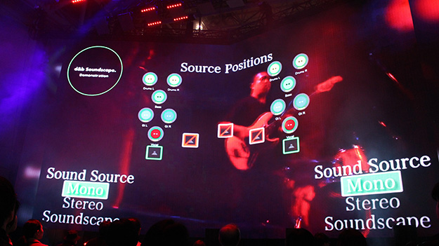 コンサート会場などではステレオシステムが多く採用されており、スピーカーの場所によって音の聞こえ方が左右されていたが、d&bのSoundscapeは見たままの場所からそのまま音が聞こえてくるシステムだ。生演奏にも対応できるよう、ライブで演算して制御している。音を定位させているのは、音響システムプロセッサDS100シグナルエンジン。ディレイと音量のレベルをDS100で全て計算して制御しているという。