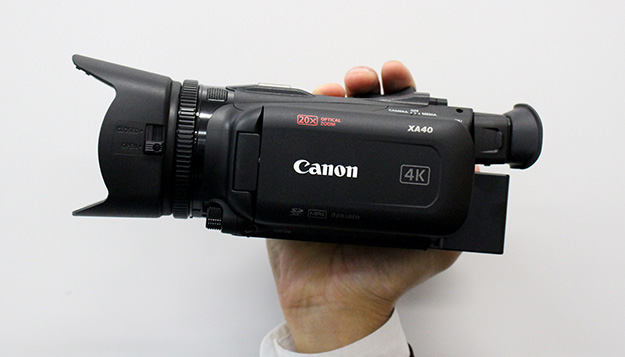 XA40は、1/2.3型CMOSセンサー、光学20倍ズームレンズ、映像処理プラットフォーム「DIGIC DV 6」を採用し、ビデオカメラ本体の大きさは幅約109mm×高さ84mm×奥行き182mm、本体質量約730gと小型・軽量ながら、広角約29.3mmから望遠約601mm相当の全ズーム域で4K/30Pの映像が撮影可能。
