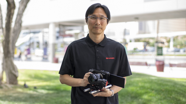 開発中の小型8Kビデオカメラを手に持つシャープの戒能正純氏