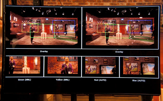 AK-SHB800GJが撮影している範囲で4つのHD画像を被写体の動きに追従可能なスタジオ自動化システム。AK-SHB800GJは周辺部の切り出しにおいても、広角レンズにありがちな周辺部の歪みを自動的に補正する機能を有しており歪のない自然な映像を実現している
