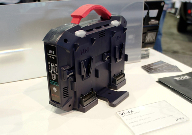 Vマウントバッテリー対応VL-4Xチャージャー。デュアルおよびシーケンシャル機能により、4つのマウントのうち任意の2つを同時に最大4つのバッテリーまで充電可能。付属のACアダプターは90W DC電源として使うことができる