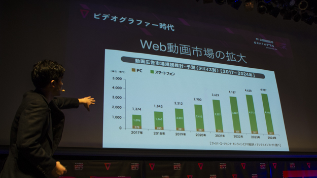 また、Web動画制作の市場は2018年で1,800億。2024年には5,000億近くの市場になる見込みであることを紹介。作る人も作る本数も必要とされている。ビデオグラファーが必要になってきていると紹介。