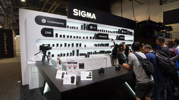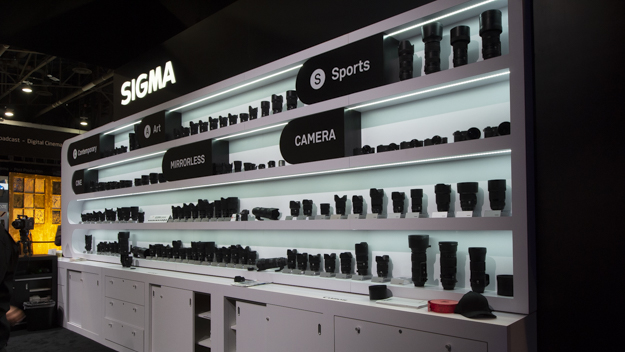 シグマブースは、シネマレンズとフォトレンズの両方を展示。シネマレンズのコーナーでは、2018年9月のIBC 2018で発表したプライムレンズ「28mm T1.5 FF」「40mm T1.5 FF」「105mm T1.5 FF」の3機種を実機と組み合わせて展示していた。