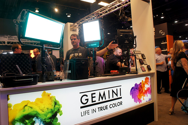 LitepanelsはGEMINIシリーズの新製品としてGemini 1×1 Softを出展。Gemini 1×1 SoftはAC電源のほか、Vマウントやゴールドマウント、XLRによる電源供給に対応しており、10フィートの距離で3200K時557lx、5600Kで614lxの照度をもつもので、先に発売となったGemini 2×1の小型サイズのモデル