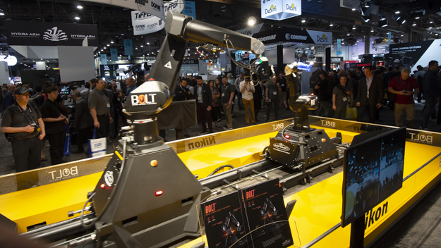 Boltと呼ばれる映像制作のロボットアームも目玉の展示だ。今年は、BoltとBolt Jr.の小さいモデルも登場。2台並べて展示していた。もともと組み込んだ動きに合わせて2台が動いているのだが、特に注目は精度と再現性だ。2台の動きがぴったりと連動していて、かつ再現性がないとできない動きになっていた。