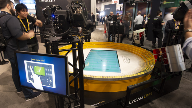 Polycam Oneは、ライブスポーツ撮影用の低価格なシングルオペレータソリューション。1台のマスターカメラを人間が動かすと、ほかのカメラも同じ被写体を追いかけてくれる半自律的なビデオキャプチャシステムだ。ブースでは、スポーツアリーナの縮小モデルを使って実演。例えば、黒い1選手を追いかけると、ほかのカメラも同じ選手を追いかけてくれる。一人で他のカメラも操作できるみたいなソリューションだ。