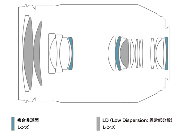 光の分散性が非常に低い3枚の特殊硝材LD(Low Dispersion: 異常低分散)レンズと3枚の複合非球面レンズをバランスよく配置した光学設計により、レンズの解像性能に悪影響を及ぼす色収差をはじめとする諸収差を徹底的に抑制しているという。