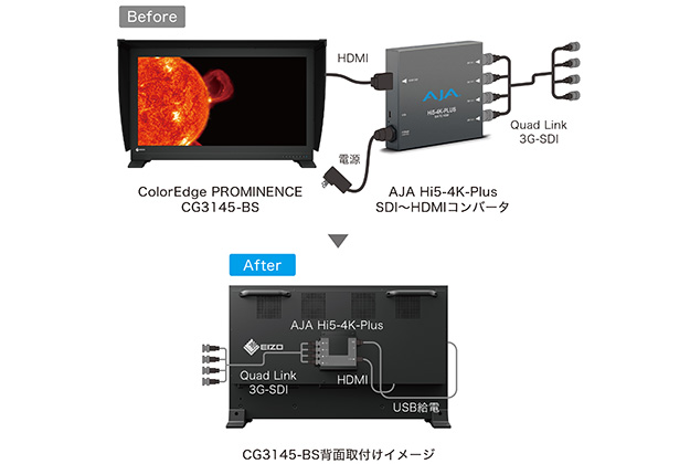 CB-01は、CG3145-BSの背面にAJA Video Systems社製のSDIコンバータ「Hi5-4K-Plus」を取付け可能な専用金具。CB-01には、CG3145-BSのUSBポートからHi5-4K-Plusへ給電できる専用電源ケーブルおよびCG3145-BSへの映像信号入力用のHDMIケーブルが付属される。