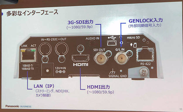 HDMI、SDI、USB、LANの4種類のインターフェイスを搭載し、そのすべてよりフルHD映像が出力可能。また、外部同期信号の入力端子を搭載し(外部同期はSDI映像信号に同期)、BBS(Black Burst Sync)および3値同期に対応する。出力フォーマットは、1080/59.94p、1080/50p、1080/59.94i、1080/50i、1080/29.97PsF、1080/25PsF、1080/29.97p(Native出力)、1080/25p(Native出力)、720/59.94p、720/50p。