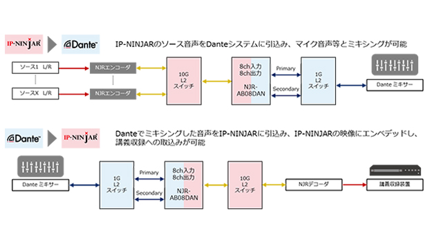 同製品はネットワークオーディオ規格で普及が進むDanteの音声信号と、同社のIP-NINJARシリーズを双方向でつなぐDanteオーディオブリッジインターフェース。NJR-AB08DANを活用することで、IP-NINJARのソース音声をDanteシステムに引き込み、マイク音声などとのミキシングや、Danteでミキシングした音声をIP-NINJARに引き込んで、IP-NINJARの映像にエンベデッドして講義収録に取り込むことが可能になるとしている。NJR-AB08DANの主な特長は以下の通り。