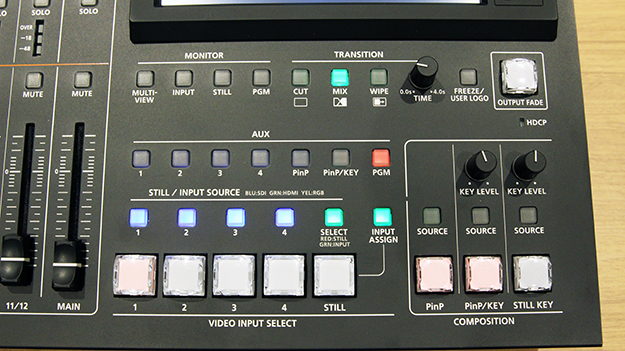 VR-50HD MK IIでは、イベントやライブ配信の現場で直感的な操作ができるようになった。すばやく映像を選択できる「AUX」、メイン映像に子画面を挿入する「PinP」、読み込んだ最大4枚の静止画を選択する「STILL」などの専用ボタンを新たに搭載。またすべてのオーディオ・チャンネルに、音声を個別に確認できる「SOLO」ボタン、「MUTE」ボタンも装備。タッチパネルで操作できる大型のマルチビュー・モニターは、静止画を4枚表示できるようになり、入力映像、合成画像を分割表示させて1つの画面で簡単に確認/設定することが可能。