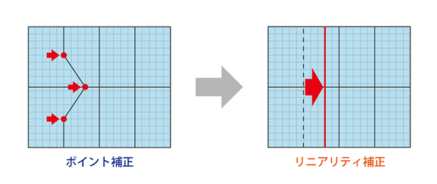 投写エリアに幾何学補正の起点となるポイントを表示させ補正する従来のポイント補正に加え、直線的に調整するリニアリティ補正ができるほか、隅角部の壁面に対して、投写エリアを補正することが可能。