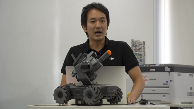 最初は、プロダクトマーケティングマネージャーの皆川正昭氏が年次開催する次世代ロボットコンテストを紹介。「RoboMaster」とは、DJIが2013年から主催しているエンジニアをヒーローに、というコンセプトを元に最新の工学技術、ゲーム性、エンターテインメント性が1つになった次世代ロボットコンテストで、昨年は世界中から2万人の学生と400校以上が参加しているイベントだという。日本からは高等専門学校、大学、企業の連合チーム「FUKUOKA NIWAKA」が、2018年から参加している。