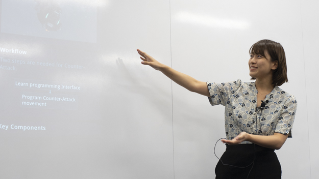 説明会では、3人のゲストスピーカーが登壇。その中でも、ソフトウェアエンジニアの池澤あやか氏は、ペットに芸をさせるイメージのプログラムを製作し、実際に動く様子を公開。その様子は興味深いものだった。