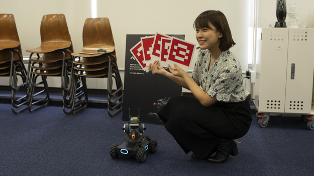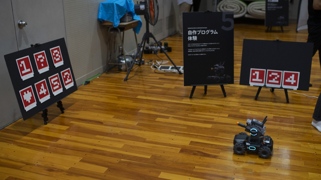 自作プログラム体験のコーナーでは、ロボマスターアプリで提供されている「自作プログラミング」で作成したプログラム「Spotter」を体験できるようになっていた。参加者がランダムで提示した3つのマーカーを自動認識し、該当する数字を順番で当てていく様子をデモしていた。