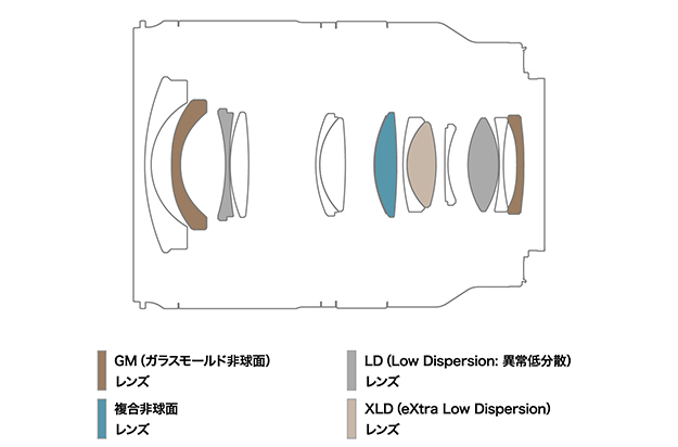 レンズ構成は11群13枚。3枚の非球面レンズに加え、光に対する異常分散性を有する特殊硝材LD (Low Dispersion:異常低分散)レンズ2枚と、さらに効果が高く蛍石に近い特性をもつXLD(eXtra Low Dispersion)レンズの計3枚を使用し、色収差をはじめとした諸収差を効率よく抑制するとしている。また、高い反射防止性能をもつBBAR(Broad-Band Anti-Reflection)コーティングの採用により、ゴースト・フレアの発生を大幅に低減。